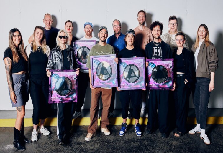 Hintere Reihe Vlnr.: Andre Lieberberg (Geschäftsführer Live Nation), Doreen Schimk (Co-President Warner Music Central Europe), Dave Farrell (LINKIN PARK), Fabian Drebes (Co-President Warner Music Central Europe), Max Gervink (Director Marketing International), Tony Harlow (Chairman & CEO of Warner Music UK)
